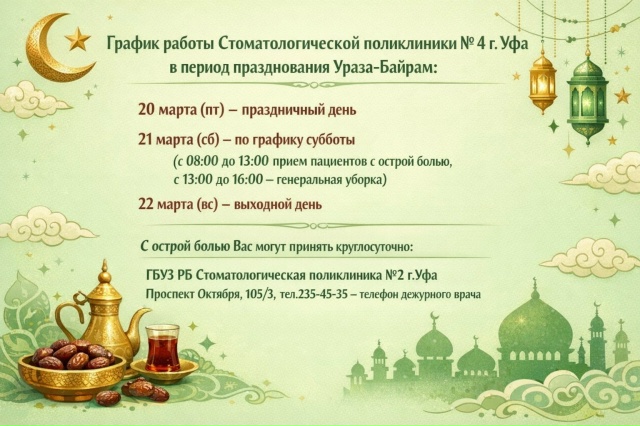 Уважаемые пациенты!График работы Стоматологической поликлиники № 4 г. Уфа в период празднования Ураза-Байрам: